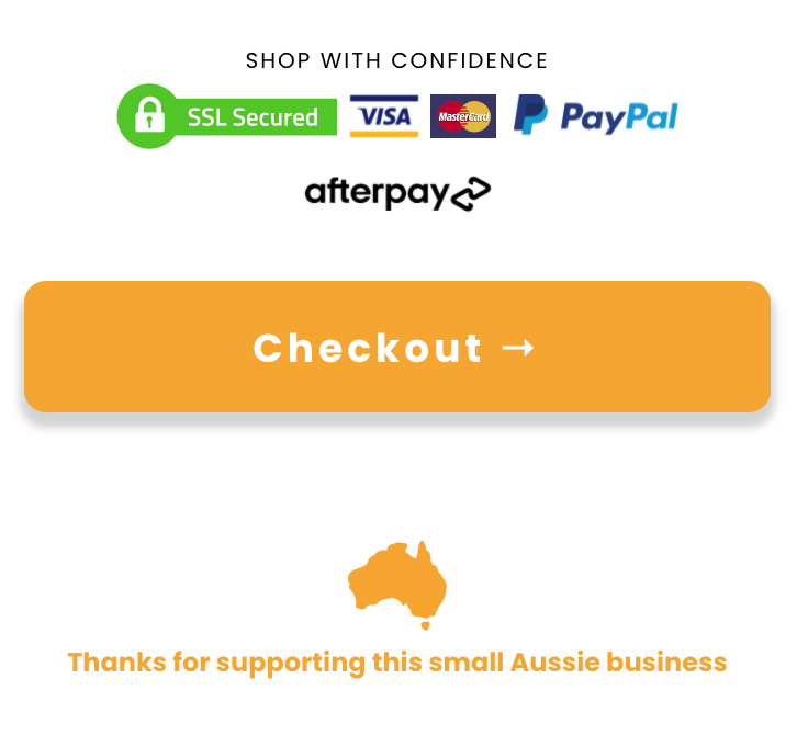 Include neat and tidy payment method options along with the further mention of secure like within this checkout. Also, having an emotional tie in always works well. “Thanks for supporting this small Aussie business” – feel good factor times a hundred!